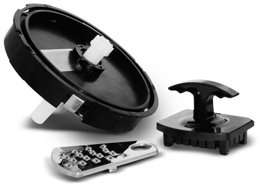 Большая чаша измельчителя емкостью 1750 мл с комплектом насадок «4 в 1»: Насадка для нарезки кубиками, Насадка-терка, Насадка-шинковка, Насадка-измельчитель, Петля для подвешивания, Прорезиненные съемные части