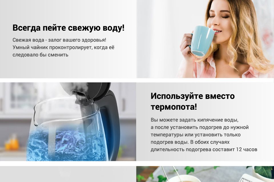 Используя мобильное приложение, вы с легкостью установите любую температуру нагрева с точностью до 1С°, чтобы правильно заваривать травяные напитки или готовить детское питание. А панель управления умного чайника позволит вам одним нажатием нагреть воду до 40, 55, 70 или 85°C без кипячения. Чтобы чайник на протяжении долгого времени поддерживал выбранную температуру воды, используйте функцию «Автоподогрев».