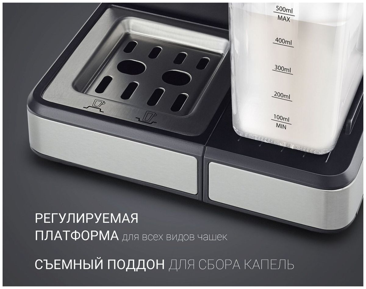 Полуавтоматическая рожковая кофеварка Polaris PCM 1536E Adore Cappuccino внешним видом отличается от других моделей этой серии. У нее металлический корпус, эргономичный дизайн и она весьма компактна. Кофе готовится в этой модели под давлением 15 бар, которое создается помпой итальянского производства. Эспрессо получается вкусным, ароматным и крепким. Платформа для подогрева чашек. В верхнюю поверхность прибора встроена подогреваемая металлическая платформа. На нее можно поставить чашки для нагревания перед тем, как налить в них кофе. Рожок с 2 фильтрами. В металлический рожок для кофе устанавливается один из двух съемных фильтров. Разный размер фильтров позволяет регулировать крепость напитка. Мерная ложечка-темпер поможет отмерить количество и утрамбовать кофейный порошок.